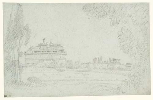 Drawing in pencil on grey paper of the Castle of St. Angelo in Rome with fields in the foreground.