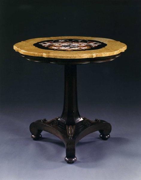A circular centre table of mahogany with a single hexagonal stem and three bun feet. Giuseppe Darmanin and Sons of Senglea, Malta made sculpture as well as table tops and specialised in commissions from grand tourists, particularly Englishmen, who passed through Malta on the way to and from the Levant. The top of the pedestal has the arms of John Howard Galton (1794-1876) of Hadzor House, near Droitwich, Worcestershire emblazoned on it. Hadzor Hall was purchased by J.H. Galton and contained a notable collection of works of art. Several paintings passed to his granddaughter Laura Galton who married Colonel Trench-Gascoigne of Lotherton Hall and the paintings remain there to this day.