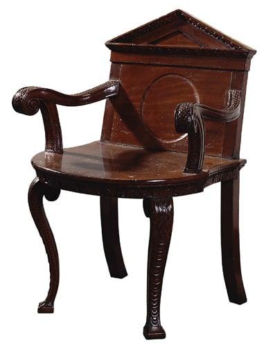 When Chiswick House reopened to the public in 1958 following a decade of restoration, it contained no furniture and English Heritage pursued the purchase of original Chiswick pieces rather than simply commissioning replicas. The Chiswick inventory of 1770 lists 'Twelve Mahogany Elbow Chairs' standing in the gallery. The architectural design, with pedimented back, acanthus, coin and fish-scale ornament, is consistent with other furniture supplied to Burlington and is attributed to Kent. Burlington, a devotee of the art of architecture, chose this pattern for temple-pedimented and truss-supported chairs in honour of Inigo Jones, who had introduced true Roman ornament to interior decoration and furnishing.