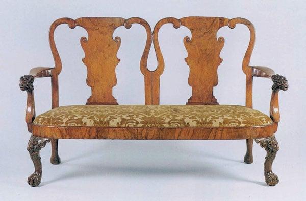 A George II walnut chairback settee. The settee has twin mask terminals, the front cabriole legs have carved lion mask knees and foliate carved ear brackets on claw and ball feet, the rear cabriole legs are plain.