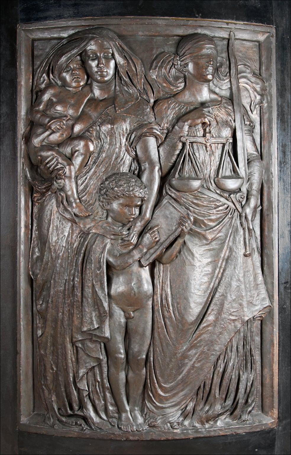 Charity and Justice is the full-size plaster model for one of the two bronze reliefs on the base of the memorial to General Gordon, a statue by Thornycroft erected in Trafalgar Square in 1888. The memorial, later moved to Victoria Embankment, is much admired, and the model now joins the Thornycroft archive given to Leeds City Art Gallery in 1982.