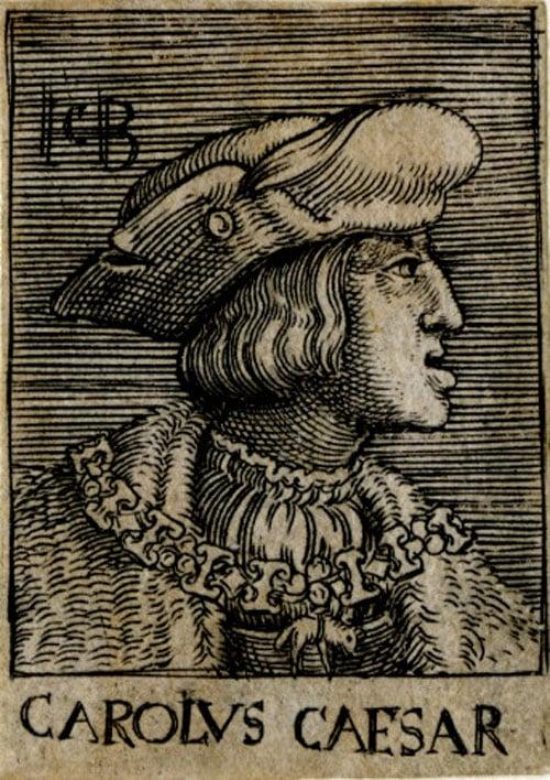 A rare early German engraving of Charles V shown in profile to right, wearing the sign of the Order of the Golden Fleece.