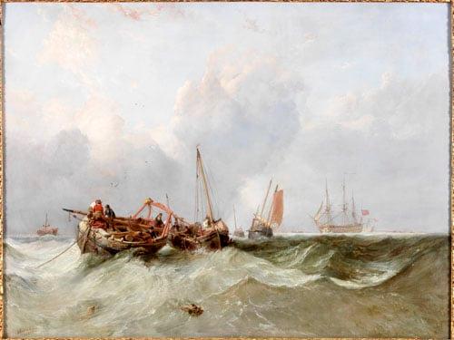 The main subjects in the painting are the three fishing luggers, all of which are trawlers. The warships in the distance are both at anchor in the Downs, the famous anchorage between the Kent coast and the Goodwins. There is also a typical 'squall-coming-on' effect to the left - rainy darkening of the sky and the sea surface flecked up by rain and wind.
