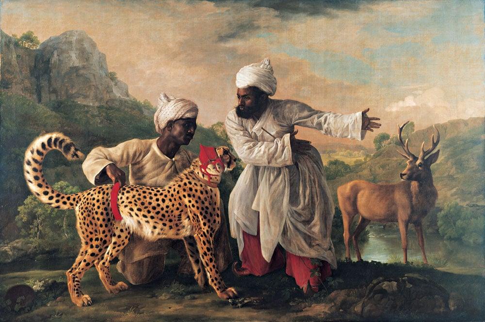 This picture was commissioned by the Governor-General of Madras, who donated the cheetah to George III in 1764. Stubbs shows an Indian who has raised a cheetah's hood and is ready to release it as another directs its attention to a stag in an imaginary landscape. Its subject is based on a story about the Duke of Cumberland releasing a cheetah with a stag in an enclosure at Windsor Great Park to watch how they kill their prey in 1764. The stag repulsed two attempts and then took to the offensive, chasing the cheetah. The air of suspended animation, the tense and anxious poses, and the exotic cast of figures and animals all conspire to make this one of Stubbs' most arresting work. The acquisition of this painting caused a sensation at the time when it was purchased for such a high price and by a museum outside London.