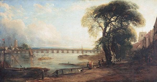 This picture shows Chelsea Old Bridge and the Thames after storm clouds have passed over. There is only just time for the calm water to reflect the blue sky, for already the clouds and the old shot-tower at the other end of the bridge are rosy with sunset, and the houses throw a deep shadow over the river bank.