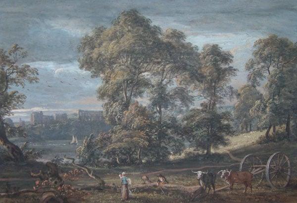 Sandby was the first artist to bring the scenery of Wales to public notice. This painting is a later reworking of a view that Sandby took some 30 years previously in his expedition to South Wales with the eminent naturalist Joseph Banks. Sandby eventually made four aquatints of Chepstow and its Castle. This particular view featured in the series of aquatints published in 1777. There are significant differences in this re-working: the foreground figures, cart and oxen and the woodcutter are at work rather than resting; and the different rendering of the castle indicate a personal familiarity with the site. Chepstow Museum previously had aquatints and engravings after SandbyÂ’s drawings but this is the first original work to enter the collection.