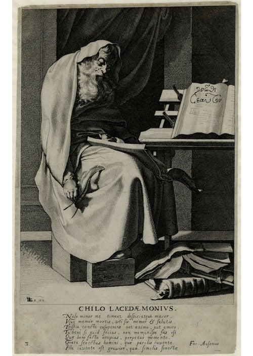 The philosopher, Chilo Lacedaemonius is shown as a bearded old man seated on a chair, wearing a cloak and holding a quill pen and book with a book-stand at right. One of a set of etchings of 'The Seven Wise Men of Greece', published 1616.
