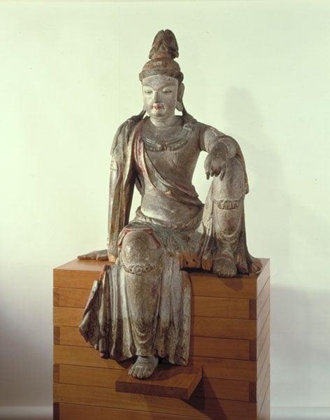 Seated figure of one of the Bodhisattva with an expression of meditation. Sculptured from joined wooden blocks. A recess between the shoulder blades may have served as a reliquary for jewels. Southern Sung Dynasty.