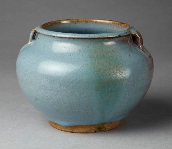 Jar of porcellanous stoneware (Chun flambe ware) with a pale blue glaze, splashed wth crimson and green. Sung dynasty; from Keechong Hong, Hong Kong.