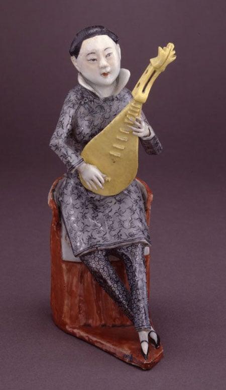 The figure was made for the European market and represents a European man playing a lute; painted in enamel colours. Period of Ch'ien-Lung (1736-1795)