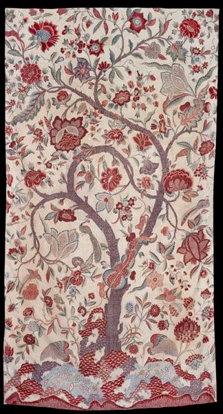 This is an outstanding example of the fine painted chintz textiles made in South-East India for export to Europe. It shows a stylised tree rising from a rocky mound. Two cranes wade in pools with fish, squirrels run among the branches, and different birds are depicted in fine detail. The asymmetric ‘tree of life’ connects to Chinese design, but it is combined with an Indian taste for minute detail. Large cloths like this were used as hangings or bed curtains. The Ashmolean has a superb collection of Indian dyed textiles made for the Middle Eastern and South-East Asian markets but this is the first example made for the European market.