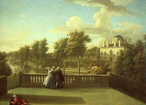 This view from the Cascade Terrace records the appearance of Chiswick House and gardens in the 1740s, by which time Lord Burlington had largely completed the design of the gardens he had begun, in conjunction with William Kent, in the 1720s. The painting is of importance as an early example of the fusion of prospect painting with the picturesque, combining topographical detail with a keen observation of light and atmosphere. The artist was a close friend and collaborator of William Hogarth by whose pencil his landscapes were often enriched, either with groups of figures from history or with rustic characters. The attribution of the figures in this landscape to Hogarth is consistent therefore with Lambert's practice and with Hogarth's style.