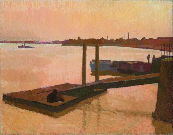 Sunset view of the river Thames by a member of the Euston Road school. One of the artist's post-war London landscapes. The capturing of light at the moment between dusk and darkness echoes Whistler and others but has a gritty realism that offered a new perception of urban landscape. The composition has a strong spatial tension, balancing the mass of water against the press of the industrial fringe, the pontoon, barges and tug.