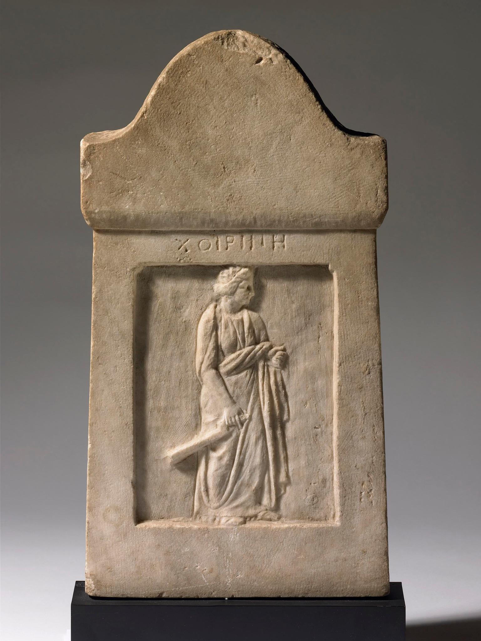 A small funerary relief of a priestess whose name was Choirine. She is depicted wearing a chiton and a cloak and holding a temple key, her badge of office. The figure is carved in low relief, slightly turned in three-quarter view, within a sunken rectangular panel. Her name is inscribed on the surround above. The stone would once have been painted and is thought to come from Eleusis, where it was probably set up at the beginning of the Sacred Way that led to Athens.