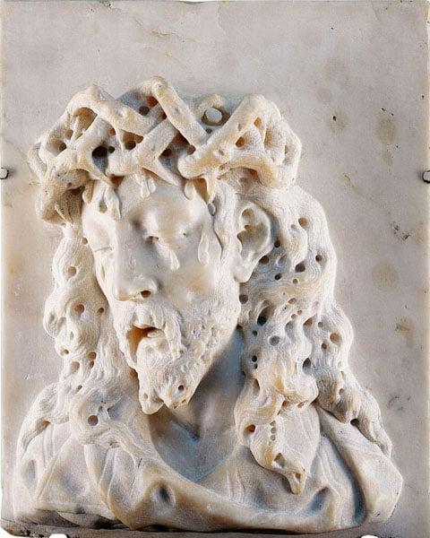 The head of Christ is shown in relief, turned slightly to his right shoulder, wearing the crown of thorns. Drops of blood are visible on his forehead and tears run down his cheeks.