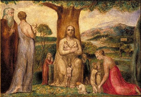 Christ sits on a stone seat in the centre under the branches of a tree. He holds two infants in His arms; others play around Him. To the left is a woman with a child in her arms; to the right a woman kneels, presenting her four children. This work is part of a collection of works by William Blake belonging to the late Graham Robertson and was included in his sale at Christie's in 1949. Graham Robertson, painter, author and theatrical designer, was widely known as a Blake collector. At his death in 1948 he bequeathed 4 Blakes to the Nation; the rest of the collection was to be disposed of by auction. He had, however, left a very considerable estate to be given to charities. This allowed his Executors to instruct the auctioneers that some of the drawings should be acquired for certain museums up to defined limits. In this way 20 works, totalling £40,281 were given by the Executors, through the Art Fund, to 6 public collections.