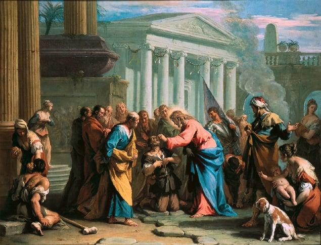 Sebastiano Ricci was one of the key figures involved in the transition of Venetian (and indeed European) painting from full-blown baroque to elegant and airy rococo. His strongest ties were with the Venetian sixteenth century, above all with Veronese. It is this tradition which lies behind this Christ Healing the Blind Man. The subject of this painting illustrates the episode when Christ gives sight to a blind man at the Pool of Siloam (envisaged by Ricci as a steaming hot spring), with the Apostles and a group of sceptical Pharisees looking on. Brilliantly coloured and (for Ricci) highly finished, the grand conception of the scene, with its balanced figure groupings, monumental architecture and wealth of incidental detail, belies the picture's small scale. Ricci is an artist whose work displays a great range of quality as well as of style, but this exquisite Christ Healing the Blind Man shows him at his very best. This work was acquired with assistance from the Wolfson Foundation.