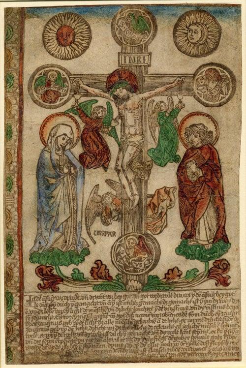 Christ on the cross between the Virgin and St. John, with xylographic inscription. One of two gifts to the British Museum by C W Dyson Perrins through the Art Fund in 1921.