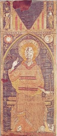 An Opus Anglicanum. A panel of purple silk, embroidered with silver-gilt and silver thread, coloured silks and small pearls. A figure of Christ is in the centre seated on a golden throne beneath a Gothic arch. A scene of the Annunciation is at the top.