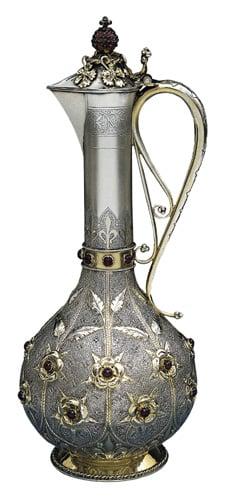 Claret jug beaten with a rose pattern, the centre of the roses are set with garnets.