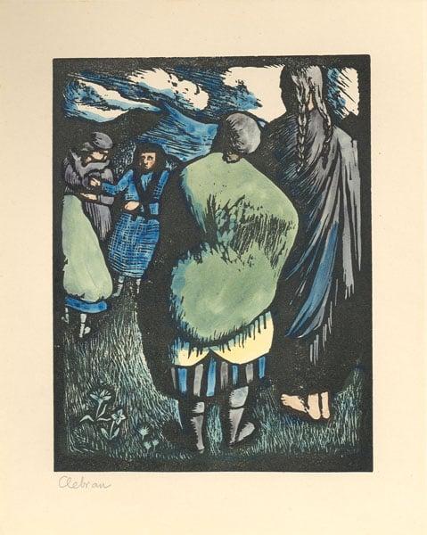 This hand coloured woodcut comes from the Caseg Press, a printing press that Chamberlain set up with her partner, the artist John Petts in Llanllechid, near Bangor. The artist was born in Bangor and spent most of her working life in Gwynedd.