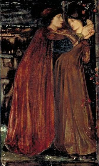 A young man in a long brown-red gown is on the left; a girl, in a yellow-brown robe on the right is standing by a stone doorway with a view of a town at night in the background.