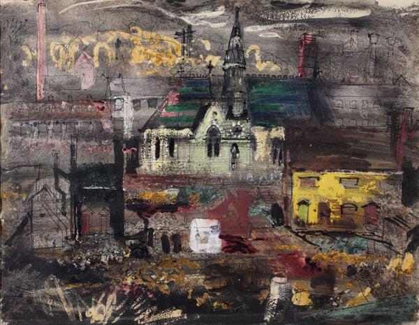 Despite the title of this work, the view is actually taken from Coalport looking south over the river to Jackfield. Behind Jackfield Church, the former Craven Dunnill tile works can be seen, in which Ironbridge Gorge Museum's Jackfield Tile Museum is now located. Piper visited the area with John Betjeman when preparing text and copy for 'A Shell Guide to Shropshire' in 1951. This work was purchased with an Art Fund grant and additional support from Robert Holden and the assistance of the Esmée Fairbairn Foundation.