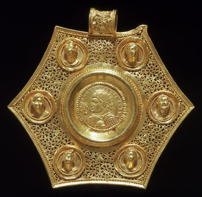 Hexagonal pendant set with a double-solidus of Constantine the Great struck at Sirmium in AD 321 to commemorate the second consulship of Constantine's sons Crispus and Constantine II. 6 miniature busts of mythological figures surround the coin. They are embossed, chased, engraved and, like the coin, are encircled by a plain collar.