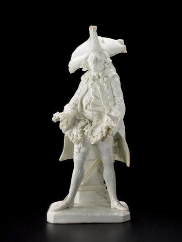 Figures of Henry Woodward as 'Fine Gentleman' from an engraving by James McArdell; Kitty Clive as 'Fine Lady' in Garrick's 'Lethe',1750 from an engraving by Charles Mosley, and a boy and girl, 1830. Chelsea dish, circa 1755, and a Worcester butter dish, circa 1760. Part of two gifts to eight museums by Dorothea Hamilton through the Art Fund in 1963 and 1971.