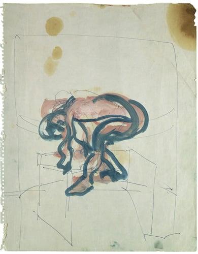 A group of 32 drawings mostly oil on paper. 6 works on paper including loose pages from a sketchbook and two pages from a boxing publication with illustrations of Jack Dempsey and Joe Beckett and Georges Carpentier over painted by Bacon.