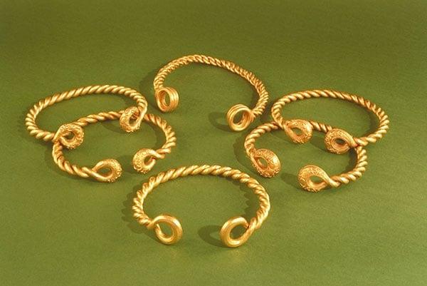 The torcs are unfinished, and are therefore of great interest from the technological point of view since they demonstrate the methods used in making such objects. They were evidently in the course of manufacture and buried for safety either by the goldsmith working on them, or by the looter. The diameter of the largest torc is 20.3 cm and they are illustrated with other torcs.