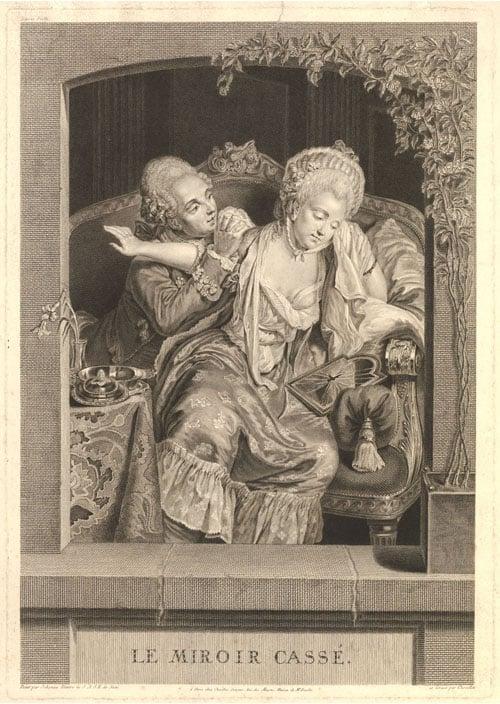 1) 'Venus and Cupid', after Richard Westall, RA, engraved by R M Meadows; 2) 'Hope and Fortune' after IB Cipriani, engraved by L Minasi, a pupil of F Bartolozzi; 3) 'Le Miroir Cassé after S.A.S.E de Saxe, engraved by Chevillet (illustrated here); 4) Elizabeth, Duchess of Hamilton' after C Read, engraved by J Finlayson; 5) La Mère Indulgente' after PA Wille, engraved by L Lempereur; 6) 'Lady Stafford' after T Phillips, engraved by C Turner. The drawings are part of a gift of 17 works presented to 7 public collections in 1933.