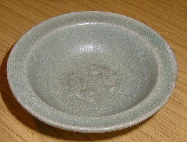 A collection of 4 Celedon bowls and a Yuan Dynasty dish. David Howell was a life long Art Fund member. He bequeathed a collection of oriental ceramics to various museums through the Art Fund, which he collected in the Far East whilst working for the British Council from the late 1950s to early 1990s. The work illustrated is a 14th century Yuan Dynasty dish with modelled fish.