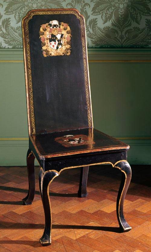 1) Pair of chairs,wood japaned black & gold. Seats & back painted with the arms of Pakington of Droitwich & Westwood Park. 2) 2 chairs of carved & gilt mahogany. 3) Yew gate-leg table. 4) Commode with mahogany veneer on oak carcase; gilt brass mounts. One chair on loan to Nunnington Hall, National Trust. Part of a donation of 16 gifts and 1 bequest to five museums by the Brigadier Clark Fund through the Art Fund between 1936 and 1992.