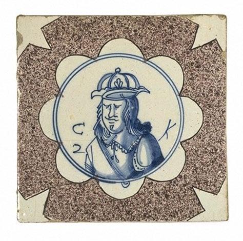 1) Dutch tile,17th century with portrait of Charles II (illustrated). 2) Saucer of enamelled earthenware, German (Bayreuth), mid 18th century. 3-4) Teapot and jug of porcelain, Italian, mid 18th century. 5) Plate of enamelled earthenware, German (Stockelsdorff),18th Century.