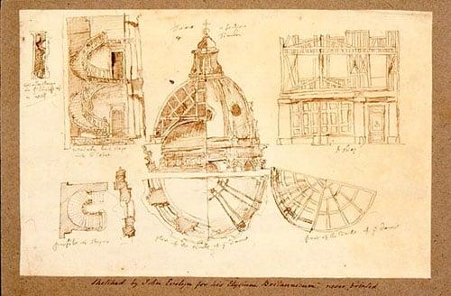 1) Studies of staircases, dome & shop front, 19 x 29 cm. 2) Studies of facade of S. Andera, Rome, balusters & pedestals, 18.5 x 29 cm. 3) Design for a 'Castellum Marpesia', 18 x 8.5 cm. 4) Design for a parterre, perhaps for Sayes Court, Kent, 20 x 19 cm.