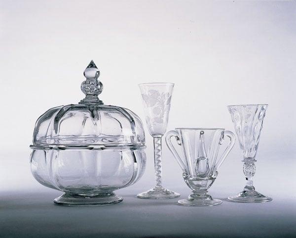 A collection of 24 pieces of glass including: various wine glasses; a toastmaster glass; gin glass; cider glass; various cordial glasses; goblet; an ale or Perry glass; a betrothal glass (circa 1740, given to Lady Fermoy by Queen Mary, wife of George V); bowl and cover; pair of salts; and a Posset Pot (circa 1725 with a ribbed bell bowl and two swan-necked handles and spout). Other items from the collection presented to the Museum and Art Gallery Kelvingrove, Glasgow.