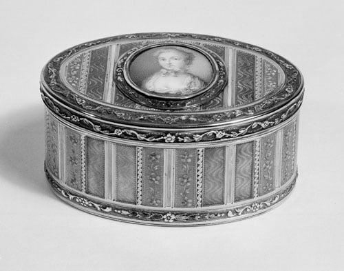 9 gold snuff boxes, 2 circular boxes with detachable lids, 2 patch-boxes. Presented as an addition to those given in 1948 by children of Mr and Mrs Henry Van den Bergh in memory of Capt. Seymour Van den Bergh and of Major James Van den Bergh. All gold apart from the patch-box in ivory and a circular box in tortoiseshell. Louis XV style.