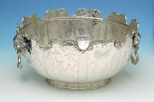 1) Montieth, silver flat-chased with the crest of Owen of Clenennau; 2) Teapot and stand by Richard Watts, silver, Britannia standard, wooden handles, engraved with the arms of Owen, and hallmarked London; 3) Coffee pot by Thomas Tearle, silver, Britannia standard, fruitwood handle, hallmarked London; 4) Tea kettle and stand by John Swift, wicker handle, engraved with the arms of Lyster of Penrhos, Montgomeryshire; 5) Tea urn by Paul Storr, silver, boxwood top, hallmarked London.
