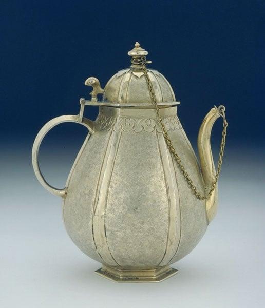 63 pieces of silver plate (almost all English) covering the period between the reigns of Elizabeth and George I including 6 Jacobean tankards, one given by the Duke of Ormonde, Chancellor of Oxford, to the Senior Proctor in 1669, a Charles II silver gilt teapot, by Benjamin Pyne 1680 (illustrated); two Porringers, Mark NS, 1667; Elizabethan tiger-ware jugs; Queen Anne maces. Also includes a collection of 70 early English spoons, 1504-1694.