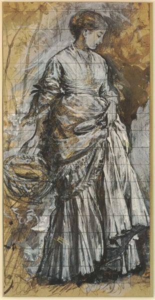 A collection of drawings by Henry Woods, his sister Fanny Woods who married Sir Luke Fildes and Frank Stone, the father of a neighbour of Fildes. Henry Woods is seen both as a graphic artist and as a recorder of picturesque life in Venice, where he settled in 1876. Stone is represented by studies for his sentimental Regency subjects and by numerous landscape sketches. The drawing illustrated is a full length portrait of woman wearing an elaborate dress by Henry Woods.