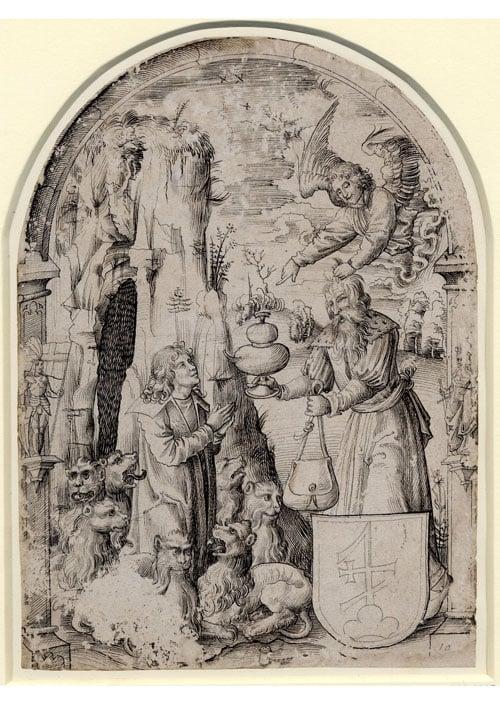 Design by Urs Graf (1484-1528) for glass panel of Daniel in the lions' den (illustrated here); drawing by Domenico Beccafumi (1485-1551) corresponding with ceiling of the Sala del Concistorio of Palazzo Pubblico at Siena; late Italian Mannerist drawing. Part of a grant for 9 works.