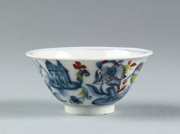 1) Porcelain butter dish, Bow, c 1755. 2) Tea bowl of hard-paste porcelain from the Vezzi porcelain factory, Venice, circa 1720-1727 (illustrated). 3) Dish of enamelled earthenware, Spanish Talavera,17th century,