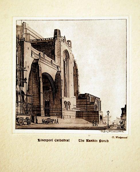 Geoffrey Heath Wedgwood was a pre-eminent engraver with noted Liverpool connections. He studied at the Liverpool School of Art from 1919-1921. In 1925 he won the prestigious Prix de Rome in Engraving. He returned to teach at the Liverpool Institute and later the School of Art in the 1930s. Charles Sydney Jones, a major University benefactor, was a patron. The University holds nearly 80 prints, the majority collected by Sydney Jones. The Ryan-Woods gift includes his Rome medal and a significant group of drawings, an under-represented medium in the University collection. The illustration depicts the Rankin Porch at Liverpool Cathedral and was used as a Christmas card.