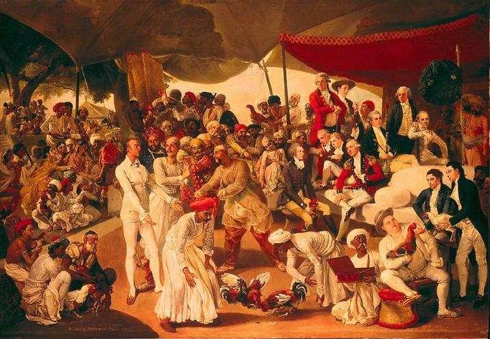 One of the most striking conversation pieces of the eighteenth century, and quite unlike any produced in England. It reveals a great deal to us about the Anglo-Indian relationship in the heyday of the East India Company. The picture represents the Nawab of Oudh and a group of European adventurers who were freeloading at his court at Lucknow. Many of the Europeans at that time led half-Indian and half-European lives and most had Indian wives. Equally, Indians themselves were attracted by European life and arts. At this brilliant and dissipated court Europeans and Indians mingled on far more equal terms than in Calcutta.