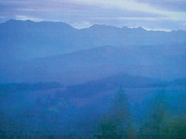 One of a series of works based on poor quality digital photographs of Colorado landscapes found on the internet. The artist has further stretched and distorted the source material and faithfully transcibed in paint the resultant pixellated screen image.