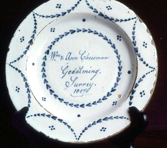 Plate, inscribed: 'Wm & Ann Cheeseman Godalming, Surrey, 1807'. Believed to commemorate the birth of the Cheeseman's first son.