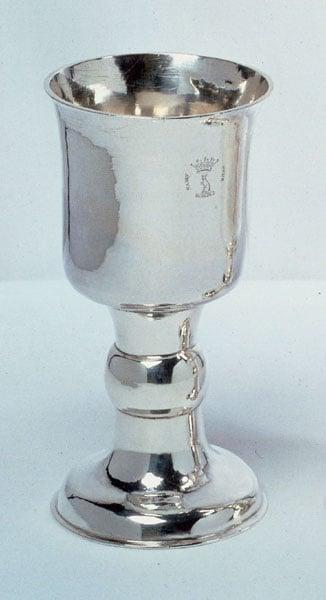 Cup stands on a raised circular foot with a flattened rim with a wide spool-shaped stem with a plain knob. The bell shaped bowl with everted lip is engraved with a crest, motto & coronet of the Countess of Sutherland.