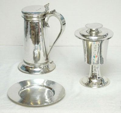 1) Flagon, h; 29.3 cm. 2) Chalice, h;21.6 cm. 3) Paten-cover, diam, 15.2 cm. 4) Paten, diam; 22.6 cm. Hallmarked London, 1646 & 1647, & stamped with the initials of the maker, 'W.T', & with two amulets above.