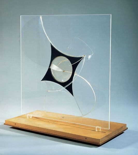 A construction of curved strips and geometrically-cut planes of perspex held together in a finely balanced state of tension. The work centres on the space within the still black element, around which transparent elements hurtle out in all directions.